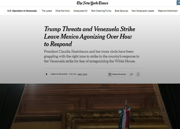 El periódico destacó que las amenazas de Trump, que durante meses parecían solo retórica, ganaron mayor relevancia tras la captura del expresidente venezolano Nicolás Maduro y las declaraciones recientes del mandatario estadounidense sobre posibles ataques directos contra los cárteles mexicanos. Peor para la administración de Claudia Sheinbaum fue que el ex mandatario venezolano mencionó en 25 ocasiones la palabra México. "Cuando vimos lo que hicieron en Venezuela, nos hizo pensar: 'Oh, esto es más grave de lo que pensábamos, y estamos en la lista de quienes podrían ser los siguientes, y peor aún, hemos sido advertidos'", dijo un alto funcionario del Gobierno mexicano que habló bajo condición de anonimato. El NYT señala que, tras la entrevista de Trump en Fox News en la que afirmó que Estados Unidos "comenzaría ahora a atacar a los cárteles", la Presidenta Claudia Sheinbaum y su equipo revisaron con cautela el tono de su respuesta pública, conscientes de que cada mensaje sería observado desde la Casa Blanca. Horas después del ataque en Venezuela, Sheinbaum publicó en la red X un fragmento de la Carta de la ONU que llama a respetar la soberanía de las naciones. En respuesta, la Casa Blanca difundió un video de Trump en el que aseguró que la Mandataria mexicana "es una buena mujer, pero los cárteles gobiernan México", lo que llevó al Gobierno mexicano a replantear su estrategia de comunicación. Al día siguiente, Sheinbaum instruyó a la Cancillería a contactar a su contraparte estadounidense, encabezada por el Secretario de Estado Marco Rubio. Aunque la Presidenta ha intentado minimizar públicamente el riesgo de una intervención militar, reconoció que la designación del fentanilo como arma de destrucción masiva y de los cárteles como organizaciones terroristas podría dar a Washington "más elementos" para justificar una acción unilateral. Según el diario, otra fuente de inquietud en el Gobierno mexicano es la acusación presentada contra Maduro, en la que México es mencionado en al menos 25 ocasiones. Para medir el nivel de riesgo, funcionarios mexicanos dedicaron la semana pasada a analizar cada declaración del presidente estadounidense. El equipo presidencial monitoreó la frecuencia con la que México aparecía en la cobertura mediática en Estados Unidos y la comparó con otros países como Colombia, Groenlandia y Cuba. Un gráfico elaborado por el equipo de la Presidencia y revisado por The New York Times mostró que las menciones a México aumentaron de manera sostenida tras el ataque en Venezuela, pero disminuyeron después del lunes, cuando la atención mediática se desplazó hacia Groenlandia. Un funcionario expresó alivio de que México estuviera, por ahora, fuera del foco.