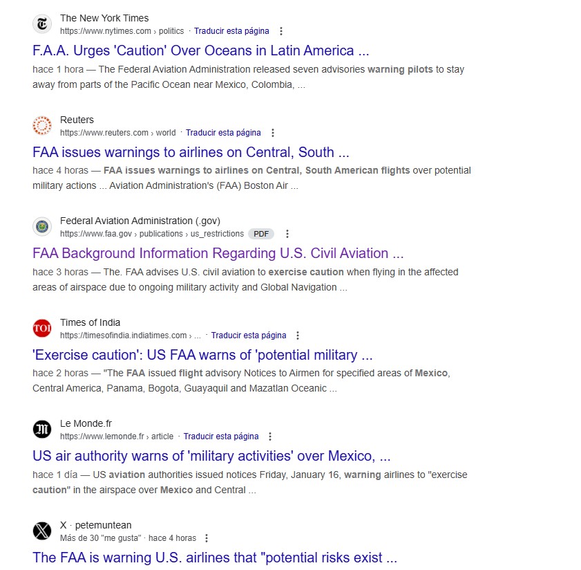 México (Newsmexico.com.mx).- El Comunicado de la FAA en español y (aquí puedes descargar la versión original en inglés) y más abajo la reacción del gobierno federal mexicano al comunicado norteameriacno. Información de referencia de la FAA sobre las operaciones de la aviación civil estadounidense en áreas específicas de las Regiones de Información de Vuelo (FIR) de México (MMFR), Centroamérica (MHTG), Panamá (MPZL), Bogotá (SKED), Guayaquil (SEFG), Mazatlán Oceánica (MMFO) y XX01. La Administración Federal de Aviación (FAA) emitió Avisos a los Aviadores (NOTAM) para las operaciones de la aviación civil estadounidense en las zonas sobre el agua de las Regiones de Información de Vuelo (FIR) de México (MMFR), Centroamérica (MHTG), Panamá (MPZL), Bogotá (SKED) y Guayaquil (SEFG), la totalidad de las Regiones de Información de Vuelo (FIR) de Mazatlán Oceánica (MMFO) y una parte del espacio aéreo no asignado del Océano Pacífico oriental (XX01). La FAA recomienda a la aviación civil estadounidense que tenga precaución al volar en las áreas afectadas debido a la actividad militar en curso y a la interferencia del Sistema Global de Navegación por Satélite (GNSS). Existen informes de interferencias intermitentes del GNSS en el Océano Pacífico oriental. Aunque las aeronaves suelen recuperar el GNSS poco después de abandonar la zona de interferencia conocida, los efectos pueden persistir durante el vuelo y afectar a los vuelos posteriores. Las aeronaves militares estadounidenses pueden operar a altitudes de sobrevuelo de crucero o inferiores, comúnmente utilizadas por la aviación civil, con poco o ningún aviso, y pueden realizar operaciones sin transpondedores, mientras continúan las operaciones militares estadounidenses en la región. MÉXICO RESPONDE